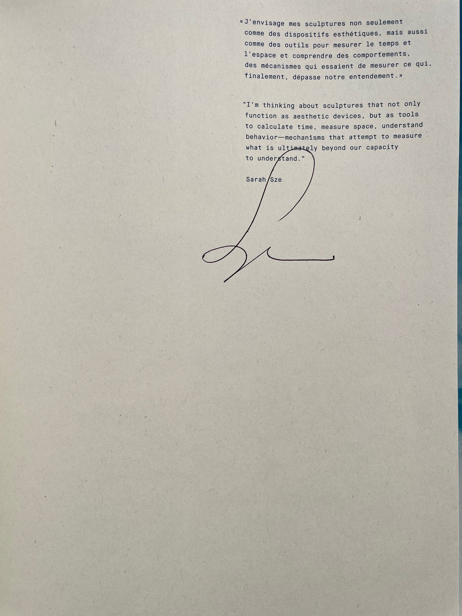 Softcover, with clear plastic dj. 177 pgs. 9.5" x 13.5" Richly illustrated catalog for Sarah Sze's second solo show at the Fondation Cartier. One of 48 different covers. Signed by the artist on first page. American artist Sarah Sze (born 1969) exhibited her first solo show at the Fondation Cartier pour l'art Contemporain at the turn of the millennium; two decades later, she returns to the exhibition spaces of Jean Nouvel's iconic building in the midst of a similarly contentious global environment with two new sculptures specially created for the occasion. This catalog was designed in close collaboration with the artist, detailing the execution of Sze's installation. An essay by philosopher Bruno Latour, a conversation between Sze and Jean Nouvel, and an essay by exhibition curator Leanne Sacramone provide further insight into the process behind this work and Sze's artistic philosophy.